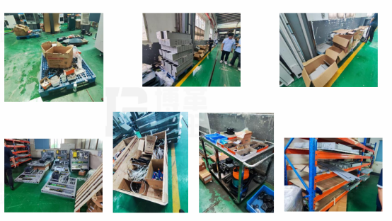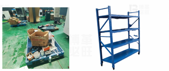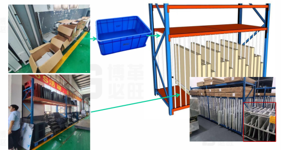 方案:車間裝配物料按機臺統一放置到物料車,方便拿用,現場整齊,紙箱統拆包裝膠箱上貨架再上生產車間(特殊配件原包裝上貨架上車間.